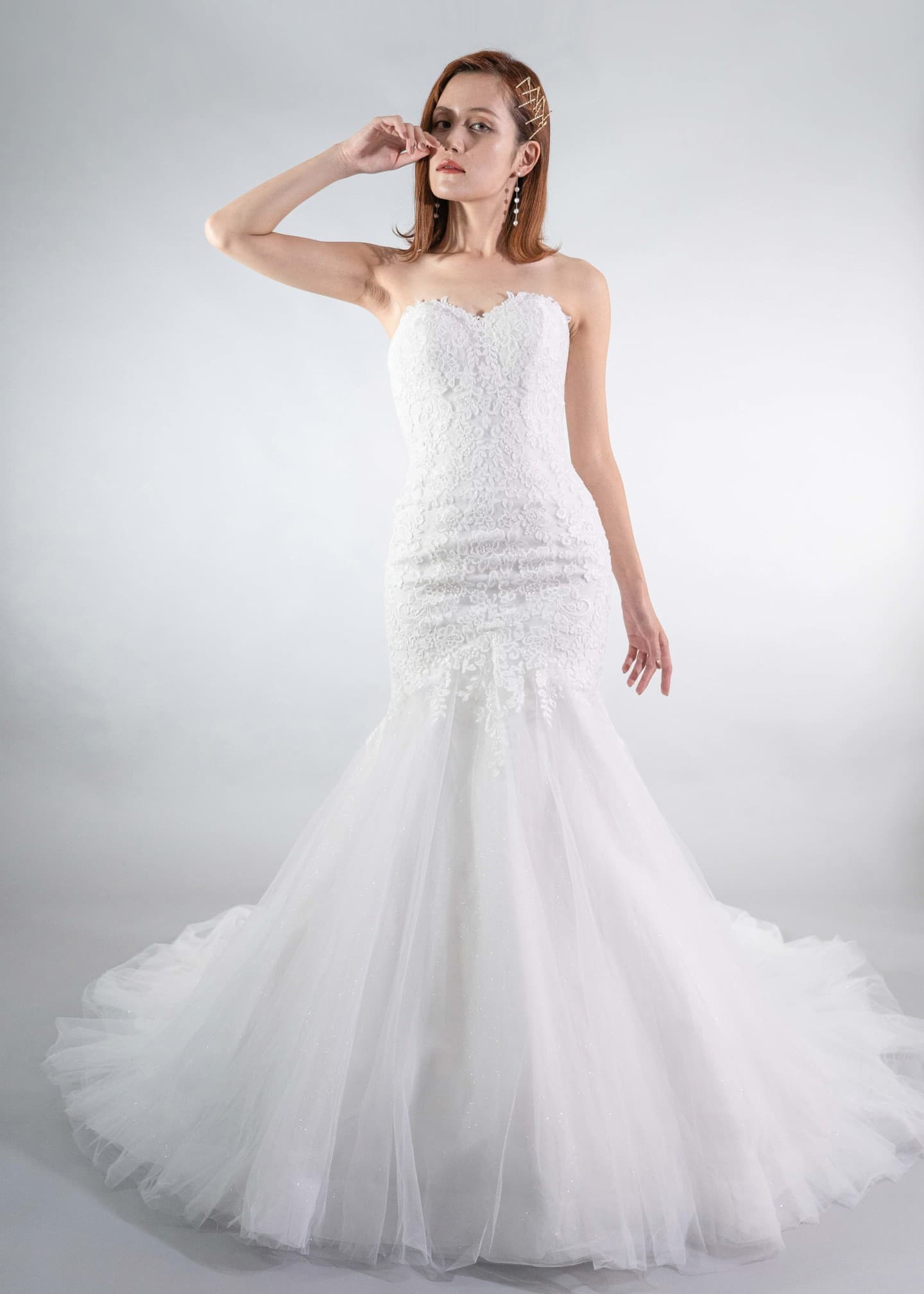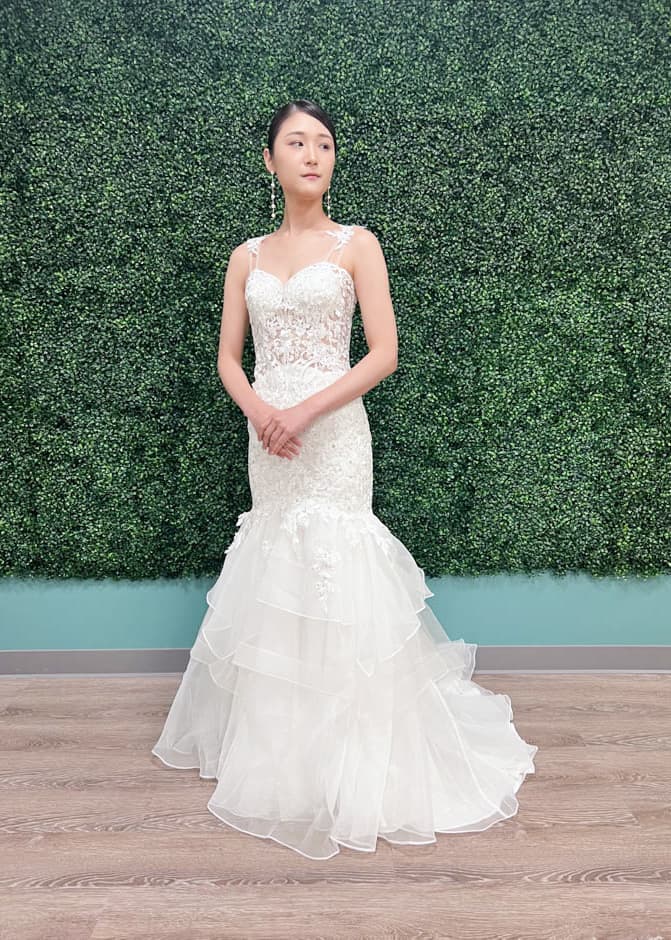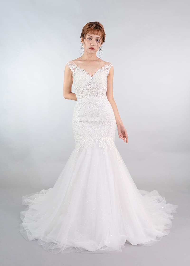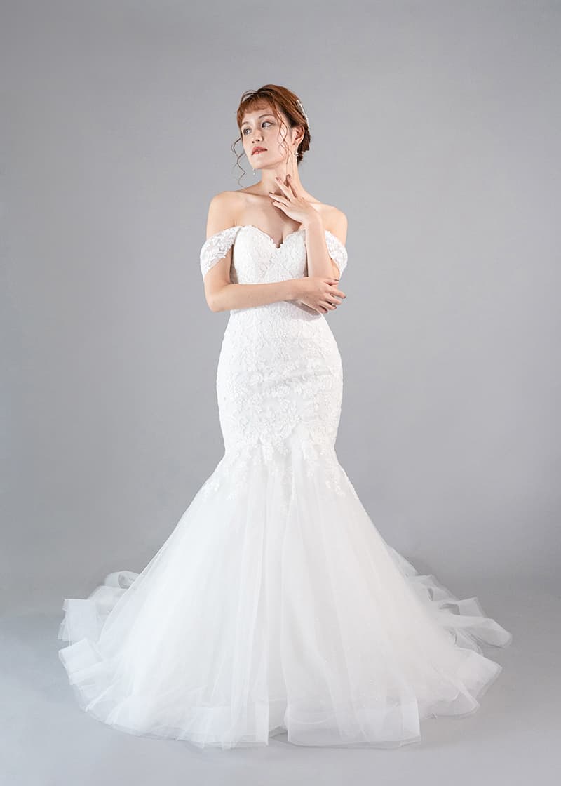 人気のオフショルダーがついたマーメイドドレス。上半身の可愛らしい刺繍と裾全体にきらめくグリッターが華やかさをプラスしてくれます。
